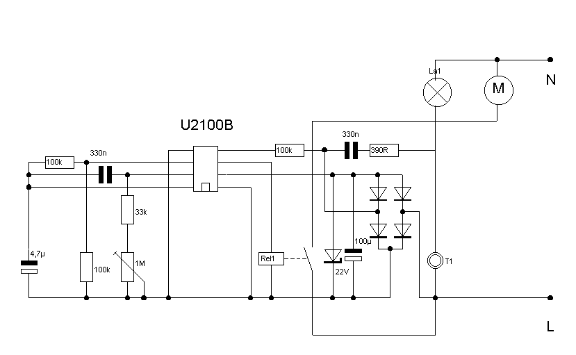Die vorgestellte Schaltung ist eine Telefunken Applikation. Beachten Sie die Rechte Dritter... und VDE, denn Netzspannung ist lebensgefährlich. Die Schaltung kommt da zum Einsatz, wo nach dem Ausschalten für eine eingestellte Zeit noch etwas anbleiben soll. Zum Beispiel E - Geräte, die noch abkühlen sollen oder der Lüfter in der Toilette. Bis auf den Gatewiderstand hat die Schaltung hier keine Probleme gemacht. |