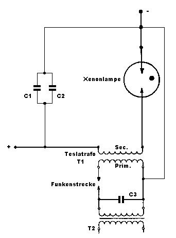 |  | | Der abgebildete Zündtrafo ( nach Tesla ) stammt aus dem Zielscheinwerfer - System XSW - 30 des Kampfpanzers Leopard I, wo er zum Zünden einer Xenon - Lampe XBO 450W1 verwendet wurde. Wie aber im Schaltplan leicht zu erkennen ist, kann man auch weitere Verwendungszwecke realisieren, z. B. einen Plasmaschneider, Ozongenerator oder einen Funkensender (Störsender ) |